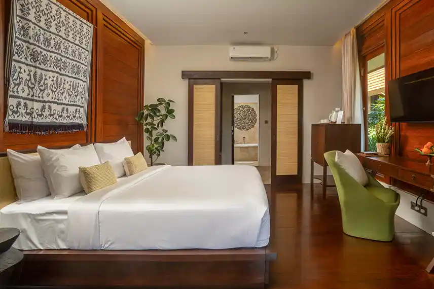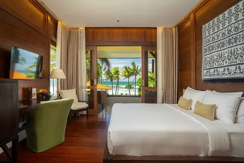 The 68 square-meter villa offers lush ocean view, an elegant Balinese-inspired home where you could enjoy the peaceful and serenity of the Resort from your room, with a comfortable bedroom, a private terrace and spacious bathroom with bathtub, a perfect place to unwind and relax.