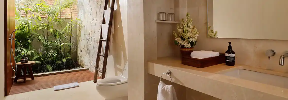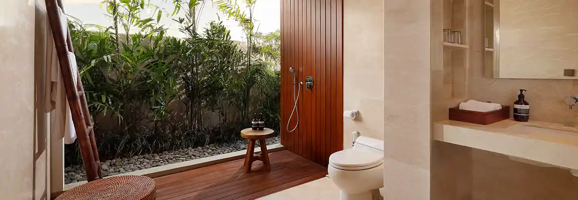 The panoramic view of lush tropical greenery from this 62 square-meter suite, it’s a serene Balinese-style home, boasting a Hollywood bed, a private terrace, and an elegant bathroom design with a bathtub.
