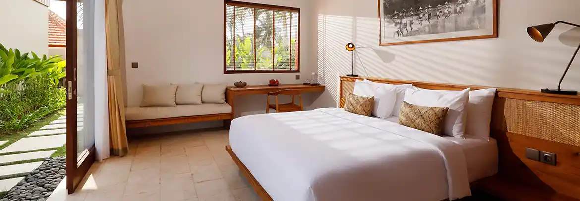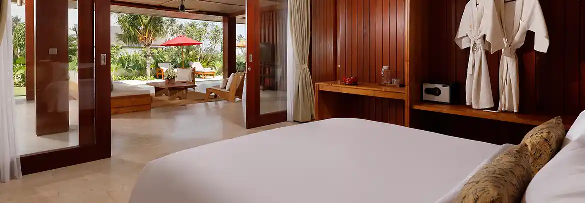 Three stylish Jacuzzi Suite Ocean View are set overlooking the tranquil sanctuary of Pasut Beach, this 86sqm square-meter suite offers a classy and minimal design with carefully curated selections of furniture, featuring a king size bed, spacious bathroom with a semi-outdoor jacuzzi creates a complete relaxation.