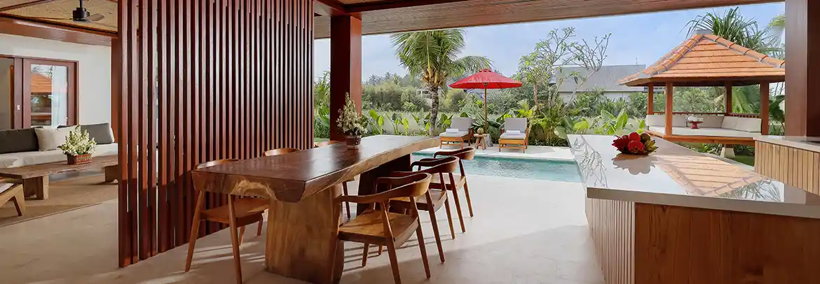 The 2 Bedroom Pool Villa offers generous space and modern comfort, ideal for families or small groups. Each bedroom features warm wood finishes, king-size beds, and ensuite bathrooms with natural stone accents and refreshing rain showers.